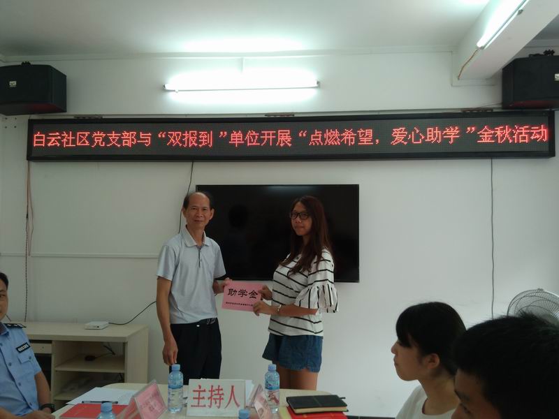 百年大计,教育为本,为帮助困难家庭解决孩子上学费用问题,近日,梧州市住房公积金管理中心党支部(以下简称“中心”)开展“点燃希望?爱心助学”活动,到“双报到”的白云社区为贫困家庭的学生麦子晴同学送去助学金,中心党支部书记谭宝成同志详细询问了麦子晴同学的家庭状况和学习成绩,当了解到麦子晴同学父母下岗,靠打散工和低保维持生活,谭书记鼓励她要努力学习,以顽强的毅力克服生活上的困难,以健康的心态面对困境,用知识改变命运,争取早日成为国家栋梁之才。