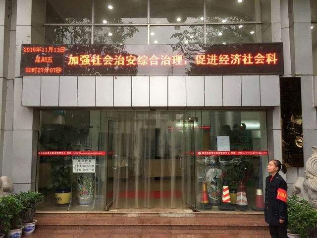 为防范社会稳定与人民安全事件发生,在我市举行“一会一节”期间,我中心派出工作人员佩戴“红袖章”,全天候在中心范围开展治安巡防工作,利用“红袖章”激发广大干部群众参与平安建设的热情。并通过中心LED屏进行社会治安综合治理宣传,营造“社会治安人人有责,平安建设人人参与”的良好氛围。