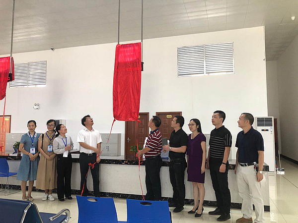 市住房公积金管理中心主任黎海荣(右五)、苍梧县人大常委会副主任罗琨玉(左四)共同为市住房公积金苍梧县管理部石桥镇业务受理点揭牌。